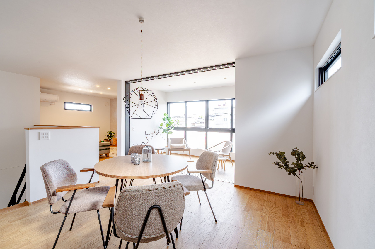 LDK約22帖の空間で、リビングとダイニング空間をしっかり棲み分け。それぞれの空間を愉しめる。