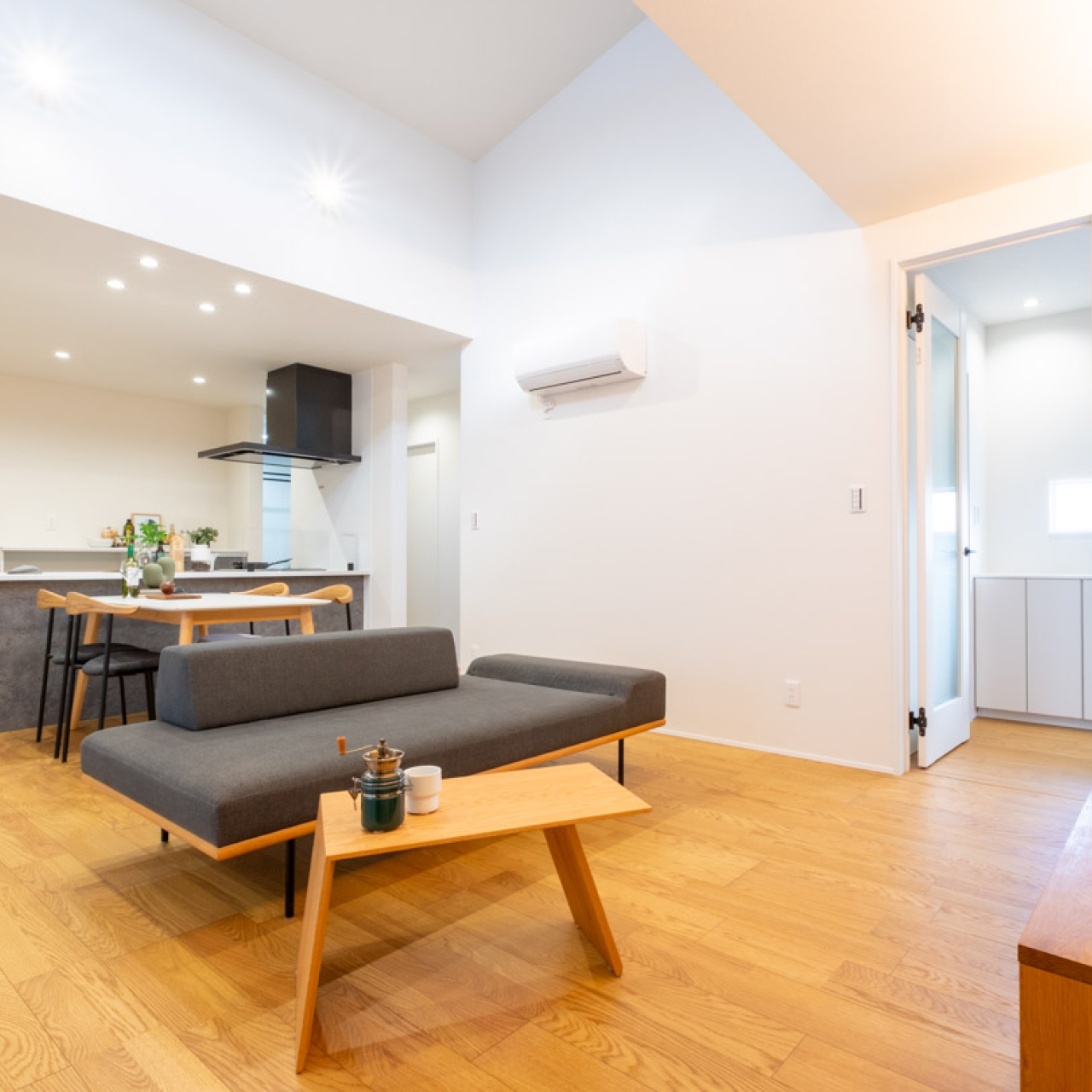 階段のない平屋ならではの利便性を最大限に引き出し、ワンフロアの心地よさを追求しました。リビング上部の伸びやかな勾配天井が、視線を上へと導き、面積以上の広がりを感じさせます。家事・収納動線を集約した設計が時間にゆとりを生み出し、すっきりと片付いた空間を維持。余計なものに惑わされることなく、大切な家族とのひとときに集中できる、豊かで洗練された暮らしを叶えます。
