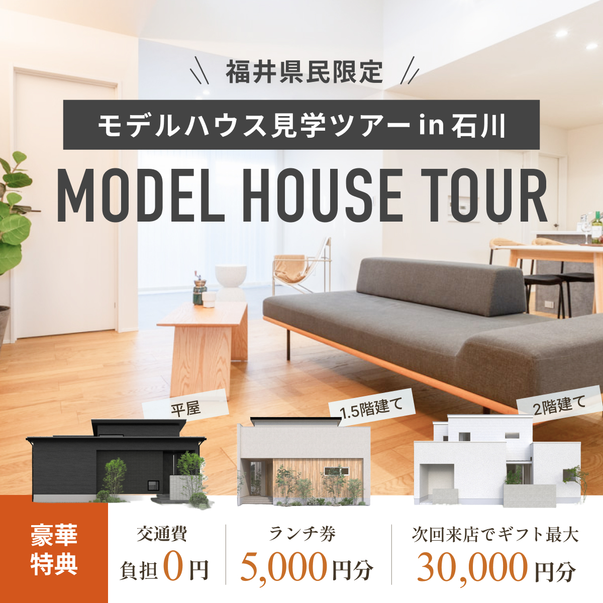 石川県にコンセプトの異なるモデルハウスが続々登場!そこで今回は、福井県にお住いの方限定で、石川県白山市にある「最新・最高峰」のモデルハウス3棟をご案内する特別ツアー企画をご用意しました。